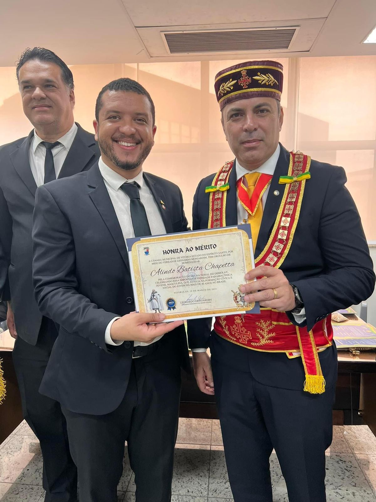 O Soberano irmão Arlindo Chapetta foi homenageado pelo irmão e vereador da cidade de Vitória, Leonardo Monjardim, com os Diplomas de Honra ao Mérito por apoiar as Ordens Paramaçônicas DeMolay e as Filhas de Jó, além do trabalho desempenhado nas ordens de aperfeiçoamento do Grande Oriente do Brasil.