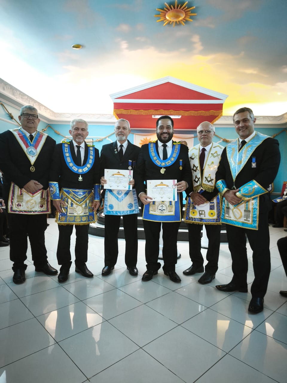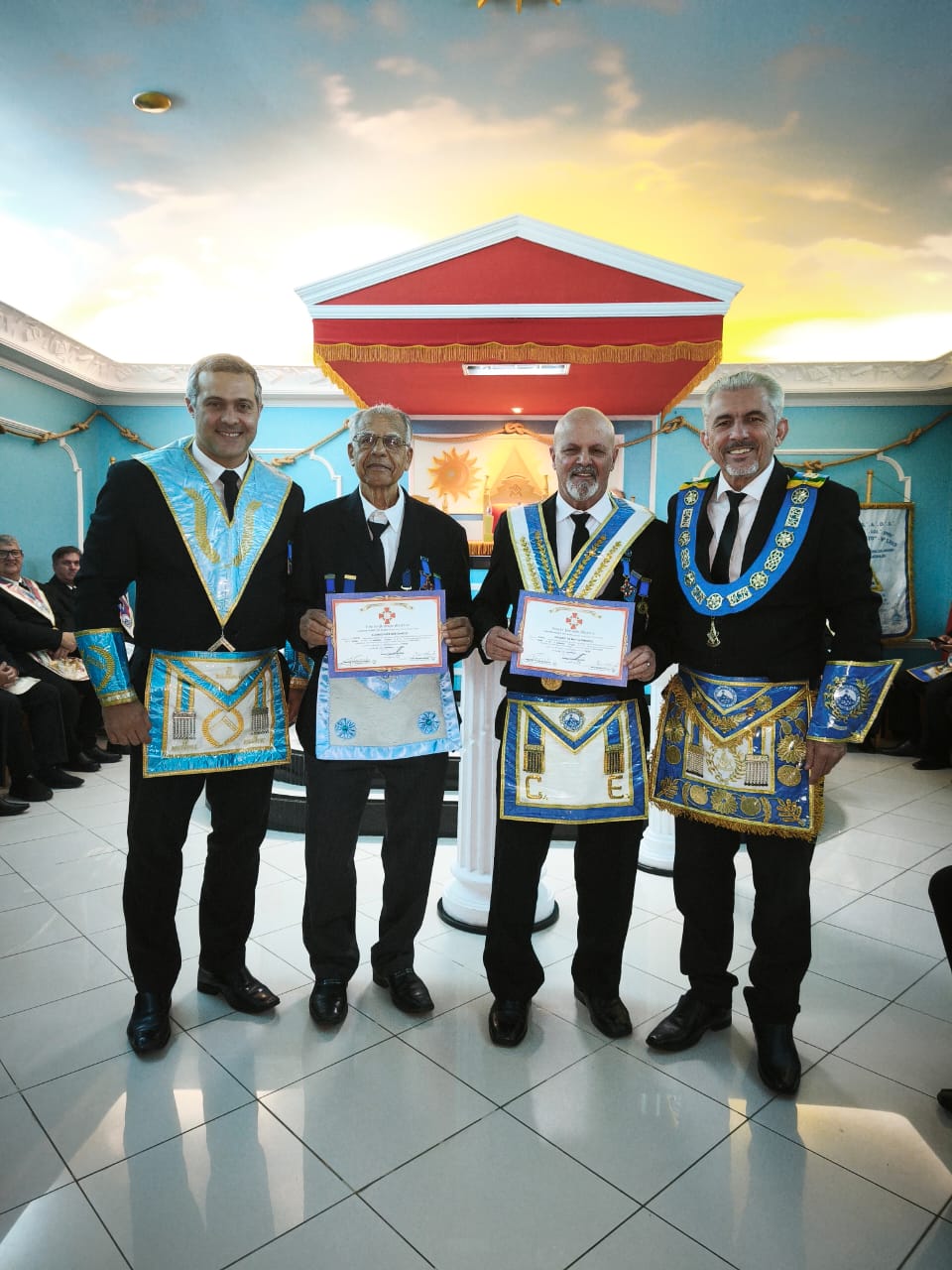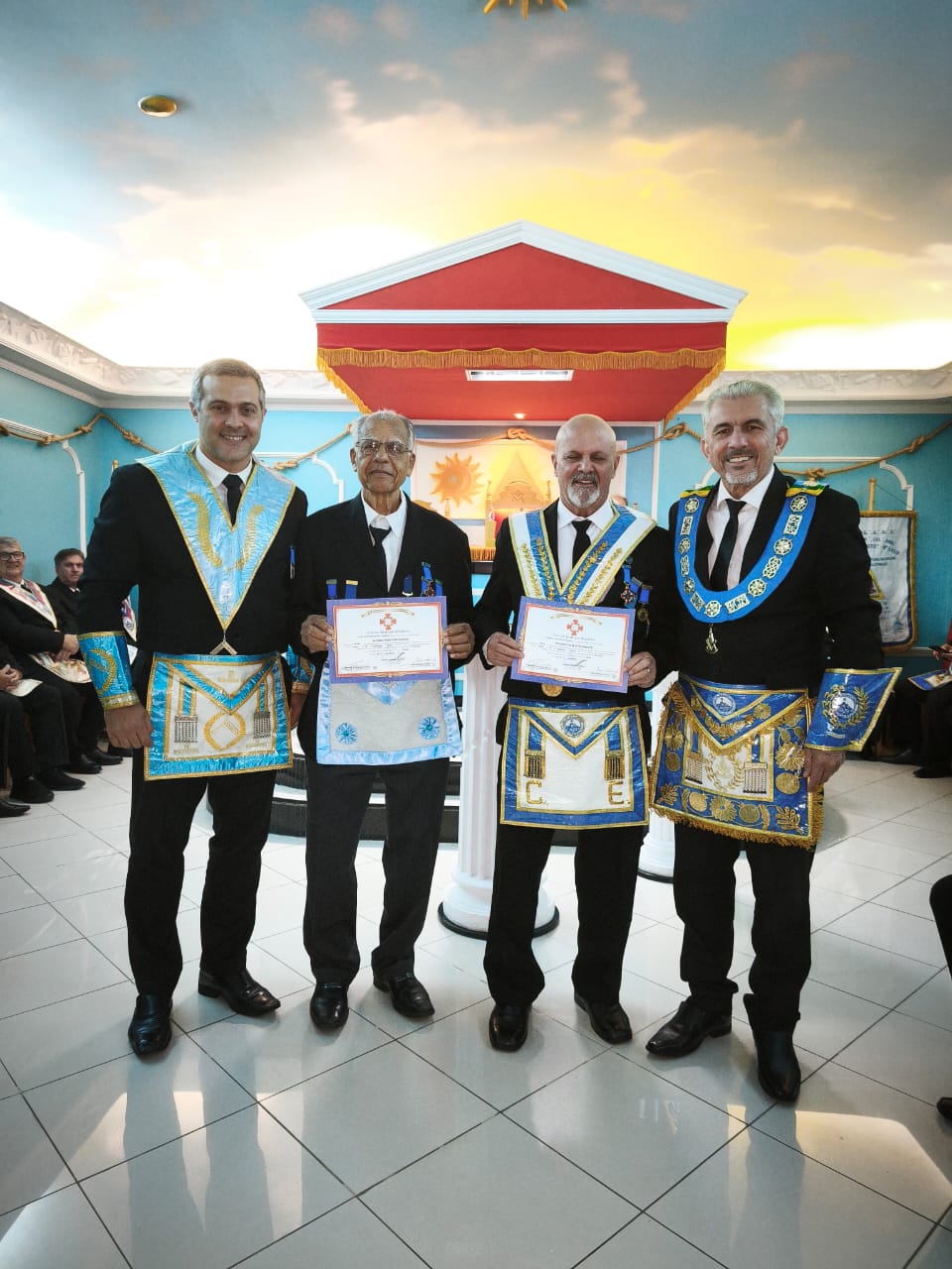 Durante a sessão, foram entregues diversas distinções em reconhecimento à dedicação, constância e serviços prestados pelos obreiros ao longo de suas jornadas maçônicas.